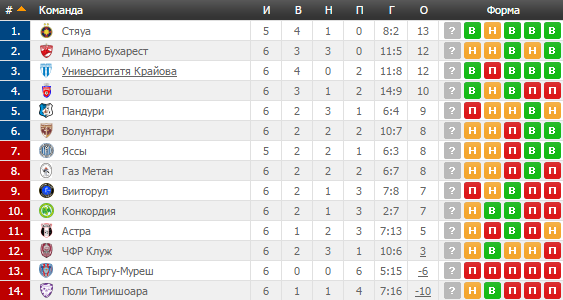Не обошлось без перестановок и в чемпионате Румынии. После прошлого тура у Стяуа был матч в запасе, но все же Динамо Бухарест владел первой строчкой, а после 6-го тура мало того что игроки Стяуа все еще не сыграли дополнительную игру, так они вышли на первую строчку в турнирной таблице. Все это стало возможным благодаря осечке самих динамовцев в домашнем матче с Газ Метаном. Столичные игроки вышли вперед довольно быстро, однако еще в первом тайме гости счет сравняли. Второго тайма хозяевам не хватило для того, чтобы взять ситуацию в свои руки и сохранить за собой первую строчку. Матч завершился ничьей.