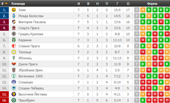 Несмотря на то, что лидерство после прошедшего тура осталось у Злина, нельзя не отметить прогресс Млады Болеслав в этом сезоне, игроки которой допустили лишь одно поражение в семи турах, да и то было более случайным, ведь проиграли они Карвине. В субботу в гости к Младе пожаловали игроки Словацко, которые были разгромлены коллективом Леоша Калводы. Как итог, после 7-го тура Млада Болеслав вышла на второе место в турнирной таблице, правда лишь благодаря лучшему показателю забитых и пропущенных, ведь у них одинаковое количество очков с пльзеньской Викторией – 16.