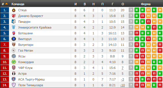 Вряд ли сможет как-то серьезно заявить о своих претензиях на чемпионство и бухарестское Динамо, даже несмотря на победу в минувшем туре. Динамовцы очень уж любят оступаться в матчах со средняками, однако в субботу им удалось добыть победу, хоть это их к флагману румынского футбола, Стяуа, и не особо приблизило. Победа над Яссами со счетом 3:1 все еще позволяет динамовцам быть вверху, правда до Стяуа целых пять пунктов.