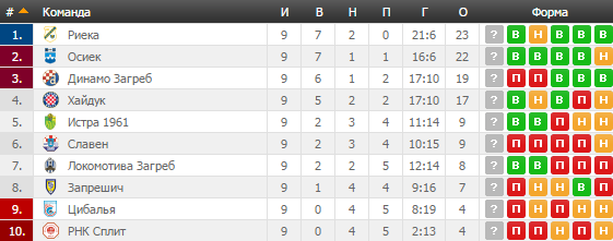 Еще несколько туров назад преимущество наверху таблицы казалось нескончаемым у Динамо Загреб, однако помимо того, что их вытесняет с передовых позиций Риека, так еще и как-то неожиданно хорошо в чемпионате выступает Осиек, игроки которого вышли на второе место в турнирной таблице после уверенной победы над явным аутсайдером чемпионата – РНК Сплит. Четыре победы кряду позволили Осиеку оторваться от Динамо на три пункта, при этом отставание от лидирующей Риеки для них составляет всего один пункт. То ли еще будет.