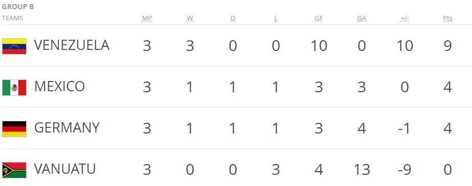 Германия сумела выиграть в группе лишь у аутсайдеров из Вануату. Но два пропущенных гола, уже после того, как счет стал 3:0, не позволили немцам финишировать выше Мексики. Теперь Германия может надеяться только на выход из третьего места.