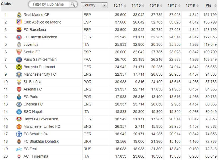 Топ-двадцатка европейских клубов выглядит следующим образом: