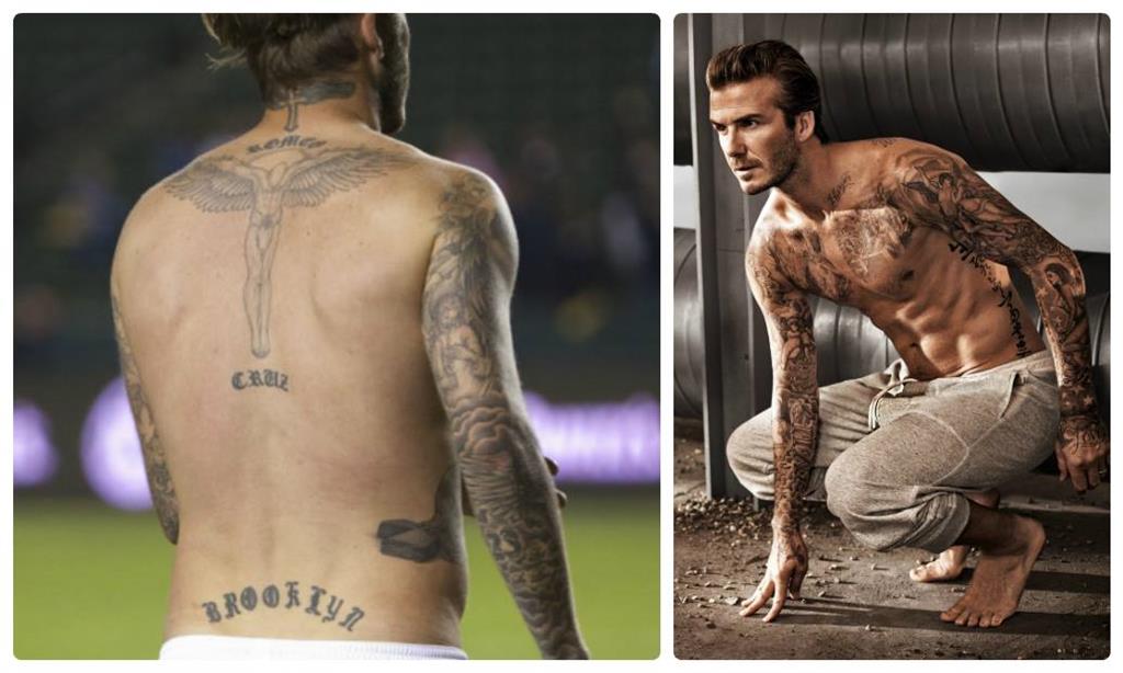 Бекхэм очень любит свою семью и посредством татуировок на теле это подчеркивает. Футболист впервые попал под иглу в 1999 году после рождения своего старшего сына, Бруклина. В следующий раз англичанин посетил тату салон спустя год, набив большего ангела-хранителя на спине. Идея дизайна в том, чтобы ангел наблюдал за именем Бруклина, которое вытатуировано на пояснице, позже там же появилось имя ещё одного сына.
