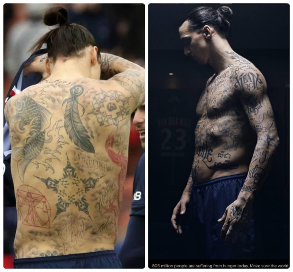 В 2015 году при праздновании гола швед снял футболку и поразил всех количеством татуировок на своем теле. Фотографии (одна из них та, что справа) сразу разлетелись по интернету и газетам. В своём Инстаграме Златан написал, что сделал 50 татуировок в поддержку голодающих. Примечательно, что это были имена абсолютно незнакомых ему человек.