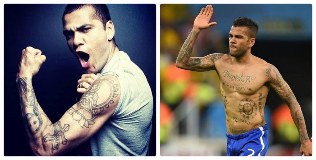 Бразильский защитник также выделяется своими татуировками. Вот, к примеру на руках Алвес выбил имена своих детей, а на правом плече футболиста красуется портрет его жены.
