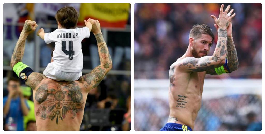 На руке футболиста располагается татуировка, которая напоминает крест. Фразы «The spirit of those dead» и «Lies in the memory of those alive» на теле Рамоса , по-видимому, напоминают о теракте 11 сентября и теракте в Мадриде. За ухом у Серхио напечатан китайский иероглиф, похожий на его инициалы SR. По-китайски означает «волк».