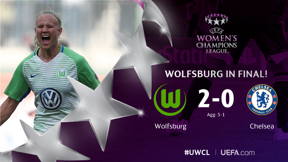 В финале женской Лиги чемпионов в Киеве встретятся Лион и Вольфсбург, обыгравшие в 1/2 финала Манчестер Сити и Челси соответственно.
