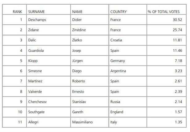 Второе место занял Зинедин Зидан, а третье — главный тренер сборной Хорватии Златко Далич.