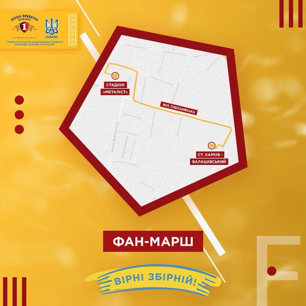 Все вместе участники фан-движения "Вірні збірній" соберутся на железнодорожной станции "Харьков-Балашовский" и в 19:15 отправятся на стадион "Металлист" фан-маршем, маршрут которого растянется на 2 км по улицам города. Традиционно, желтый – цвет дресс-кода на фан-марш и матч национальной сборной.