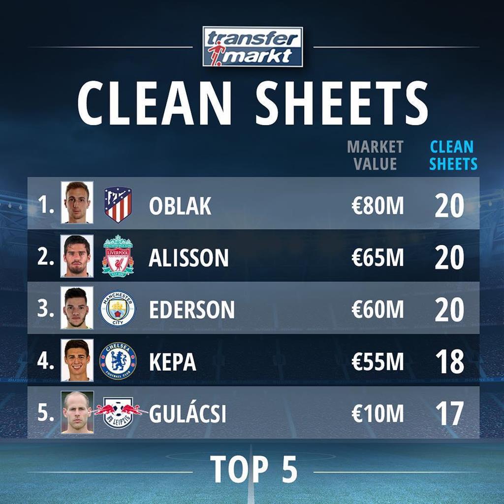 Transfermarkt проанализировал, кто чаще всего сохраняет свои ворота сухими среди ТОП-5 чемпионатов.