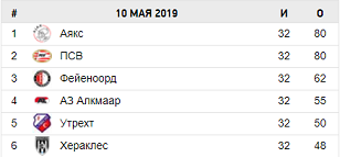 До завершения чемпионата Нидерландов осталось два тура. ПСВ и Аякс уже на протяжении четырех туров идут нога в ногу. Амстердамский коллектив имеет разницу голов +81, ПСВ +71. Именно по этому показателю будут определять чемпиона, если оба гранда не потеряют своих очков в двух заключительных матчах.