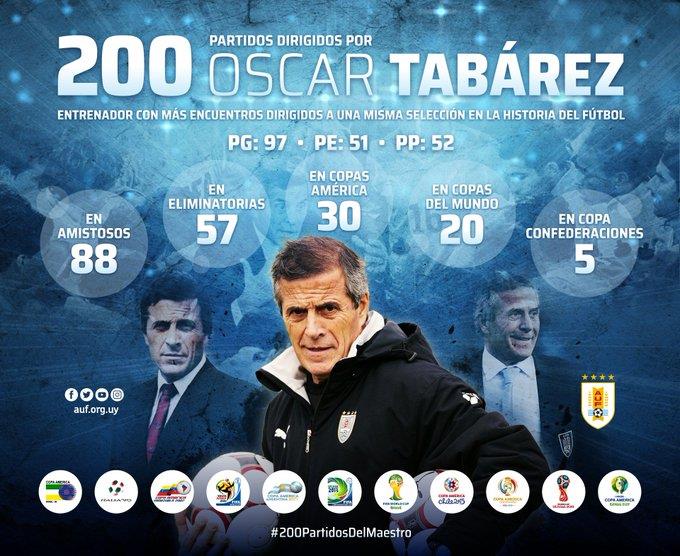 200 — Оскар Вашингтон Табарес стал первым тренером, который провел 200 поединков во главе одной национальной сборной. Ближайшим преследователем наставника сборной Уругвая является Йоахим Лев, на счету которого 179 матчей.