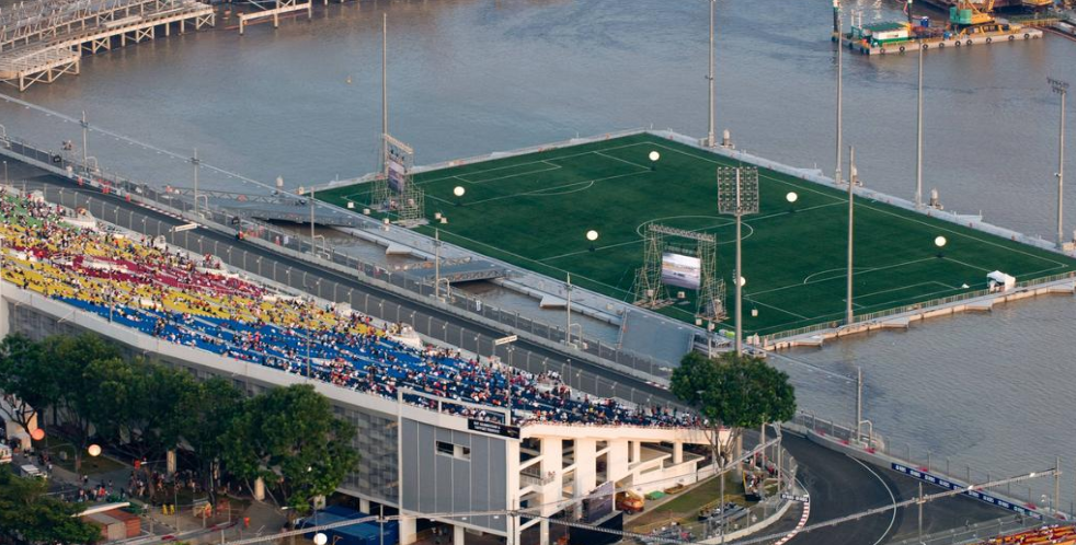Название стадиона четко отображает его суть. Само поле находится на плавучей сцене в заливе Марина-Бэй. Трибуны, которые вмещают 30 тыс зрителей, расположены на берегу. Между трибунами и стадионом проходит участок трассы Формулы 1 (Марина Бей).
