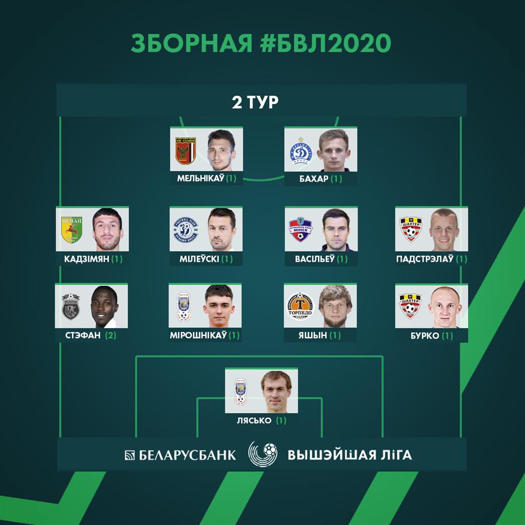 По итогам второго тура Высшей лиги, в символическую сборную попали три игрока, ранее выступавших в чемпионате Украины — Артем Милевский (Динамо-Брест), Гегам Кадимян (Неман) и Александр Васильев (Минск).