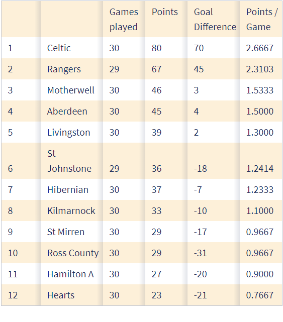 В Лигу чемпионов получат путевки Селтик и Рейнджерс, в Лигу Европы — Мазеруэлл, Абердин, Ливингстон. Вылетает из элитного дивизиона Хартс.