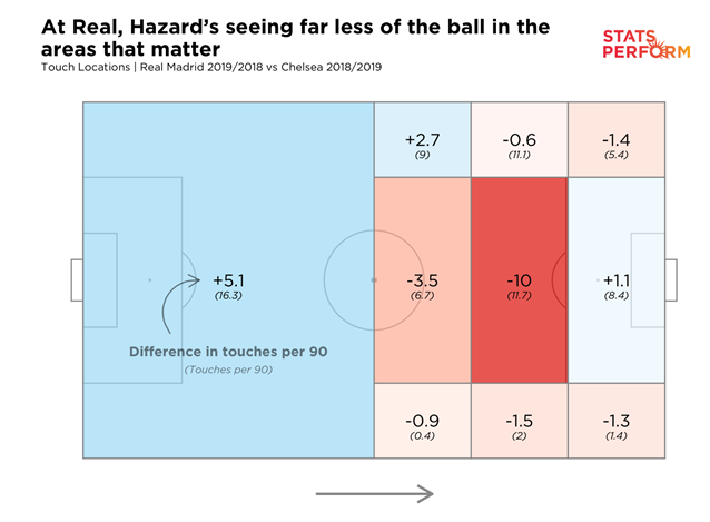 Наконец, вот как Азар позиционируется в Реале. На графике ниже от Stats Perform мы видим, как касания Азара за 90 минут в различных областях поля изменились по сравнению с Челси в прошлом сезоне и Реалом в этом сезоне.