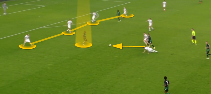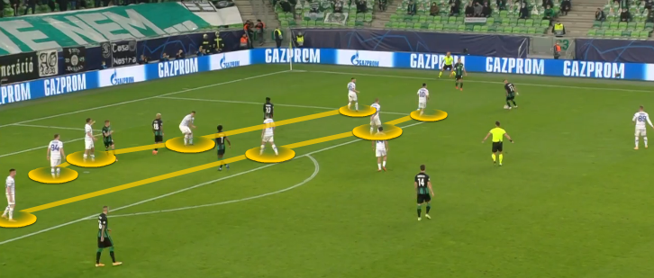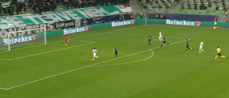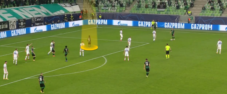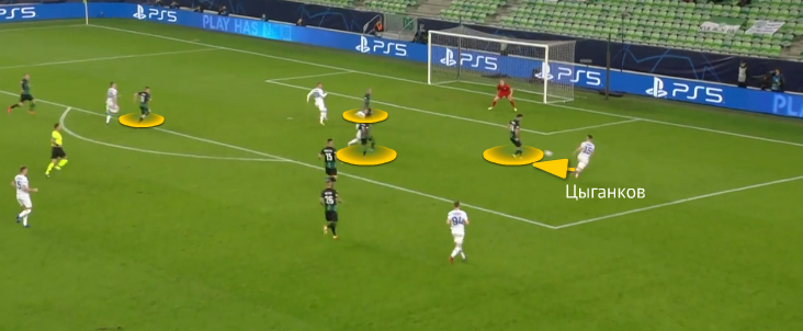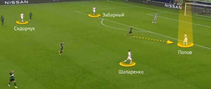 10-й номер Ференцвароша забегает в зону между левым защитником и левым центральным защитником. Караваев уже выдвинулся выше страховать Шапаренко, а Нгуена должен закрывать либо Сидорчук, опускаясь ниже, либо Попов должен выдвигаться выше, передавая своего игрока Забарному, а тот своего Кендзере. Не сыграл ни один, ни второй. Пары секунд игроку Ференцвароша было достаточно, чтобы решить этот эпизод.