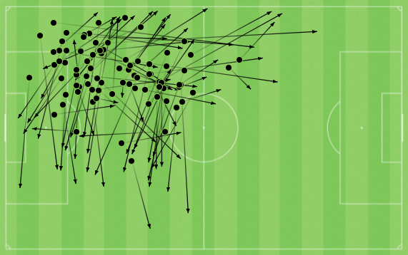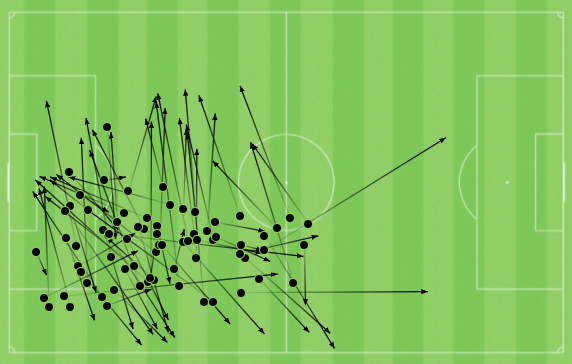 Тут и оголилась проблема отсутствия Миколенко в центре обороны, который обладает "первым пасом". Стоит только взглянуть на вектор передач Попова и Забарного. Центральные защитники киевлян практически не делали передач на половину поля соперника, что значительно усложняло варианты выхода из обороны в атаку.
