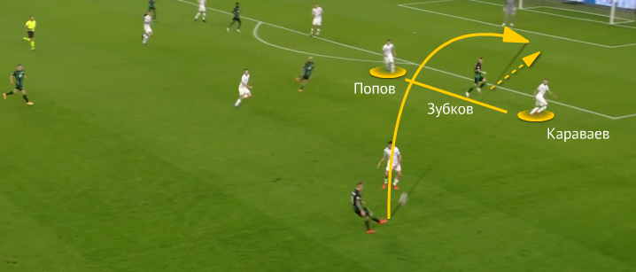 И если вы думаете, что Нгуену повезло найти эту зону, то вот еще в первом тайме Зубков атакует пространство между левым защитником и левым центральным защитником. Правда, партнер Зубкова не сумел исполнить передачу должным образом.