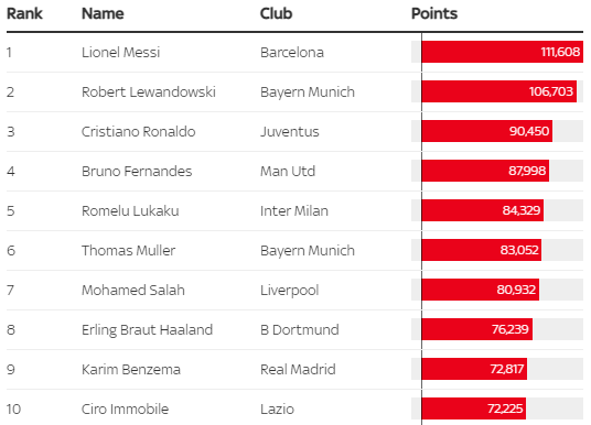 Лионель Месси стал лучшим игроком прошедшего года по версии Sky Sports, опередив Роберта Левандовски и Криштиану Роналду.