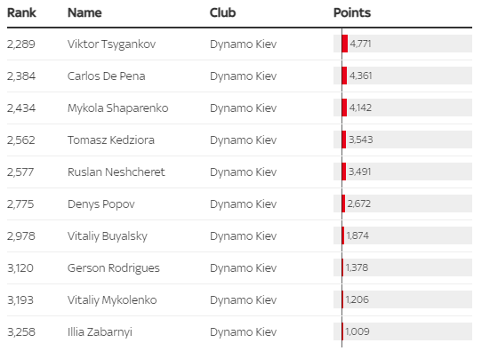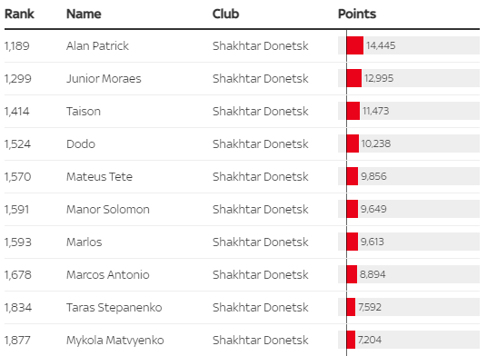 Среди представителей Шахтера и Динамо наивысшая позиция досталась Алану Патрику — 1189. Список лучших игроков Шахтера по версии Sky Sports: