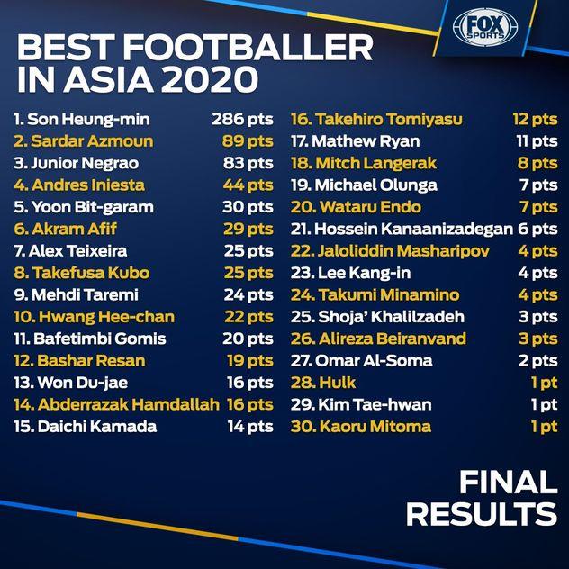 Телеканал Fox Sports Asia в конце 2020 года провел опрос среди футбольных журналистов, представляющих страны/регионы из числа национальных ассоциаций Азиатской футбольной конфедерации, в котором предложил распределить баллы среди претендентов на звание Лучшего футболиста Азии-2020.