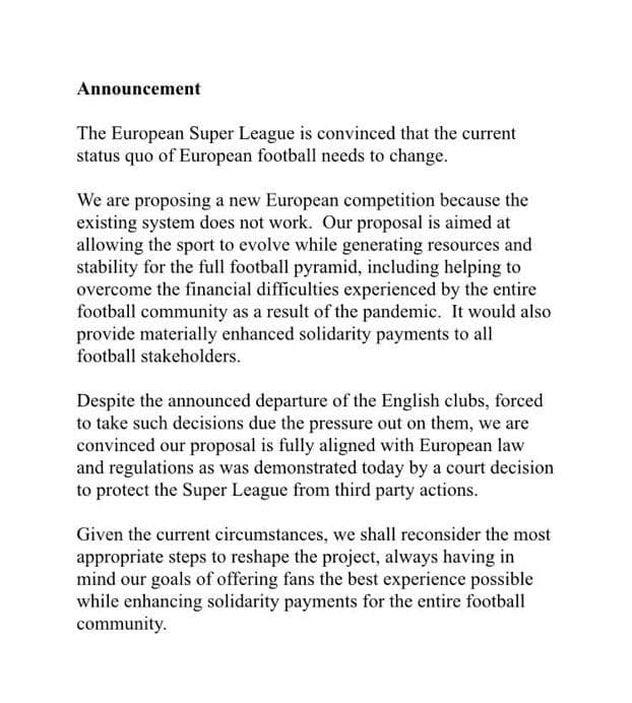 Несмотря на объявленный уход английских клубов, вынужденных принимать такие решения из-за давления на них, мы убеждены, что наше предложение полностью соответствует европейскому законодательству и правилам, как это было продемонстрировано сегодня решением суда о защите Суперлиги от действий третьих лиц.