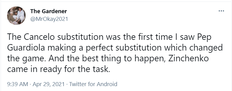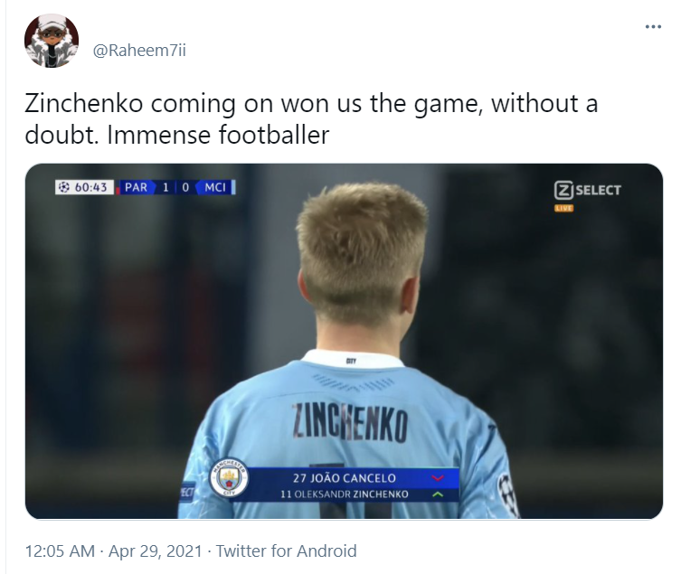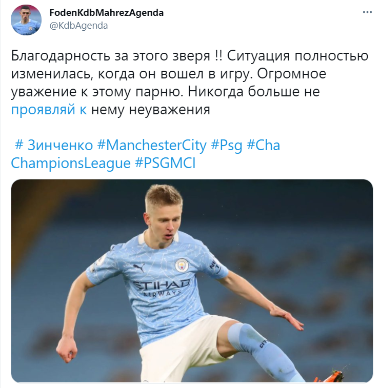 "Замена Канселу была первым разом, когда я увидел, как Пеп Гвардиола делает идеальную замену, которая изменила игру. И, что самое лучшее, Зинченко подошел к роли человека, который ее изменил".