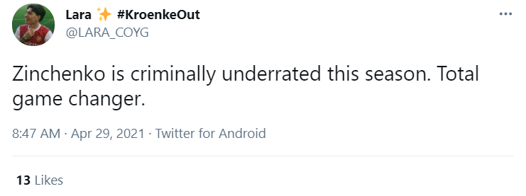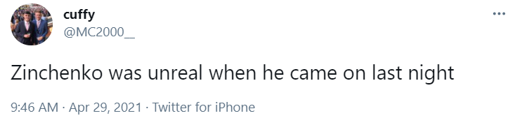 "Если недооценка — это искусство, то Зинченко — его Пикассо. Полностью изменил игру для нас прошлой ночью. Просто посмотри на это касания от него".