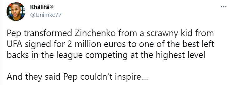 "Пеп превратил Зинченко из тощего парня, подписанного за 2 миллиона евро, в одного из лучших левых защитников лиги. И кто-то говорит, что Пеп не умеет вдохновлять".