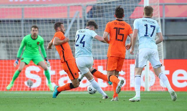 Единственное, что стоит отметить — шотландцы играли чуть агрессивнее в прессинге, что сказалось практически сразу. На 11-й минуте де Лигт выносил мяч из левого фланга своей штрафной в центре поля, но Депай уступил в борьбе Хендри. Получив мяч перед чужими владениями, защитник не стал ничего придумывать, а просто на силу пробил в дальний угол, заставив фанатов Нидерландов в очередной раз задаться вопросом об отсутствии "коронавирусного" Силлессена в итоговой заявке на Евро-2020 — Крул пропустил уже с первого удара в створ.