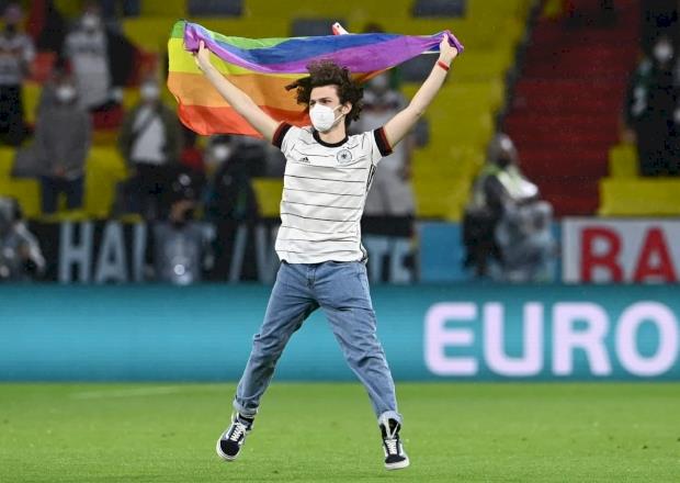 Матч Германия — Венгрия в Мюнхене немного опоздал со стартовым свистком — во время исполнения национальных гимнов на поле появился фанат с радужным флагом, которого далеко не сразу сумели поймать.