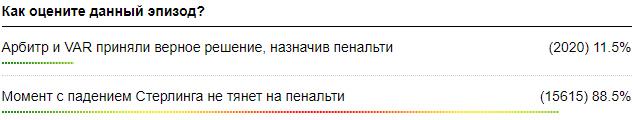 По итогам опроса внушительное большинство пользователей считают, что момент с падением Стерлинга в штрафной датчан не тянул на пенальти. За этот вариант проголосовало 88,5% читателей.
