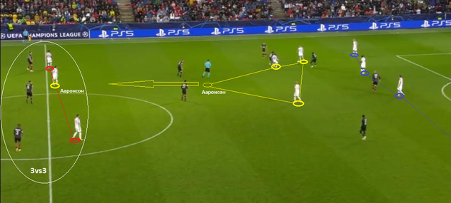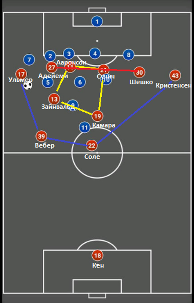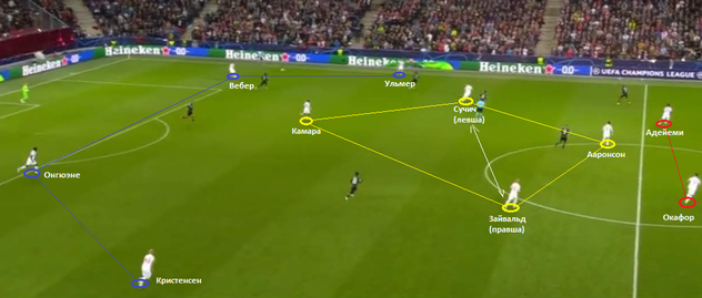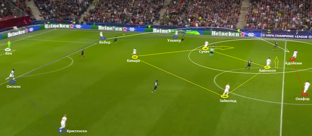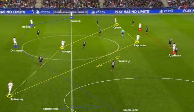 Ниже — пример из матча с Лиллем. Вебер делает заброс в зону Адейеми, куда еще перед передачей начали стягиваться Ааронсон и Сучич.