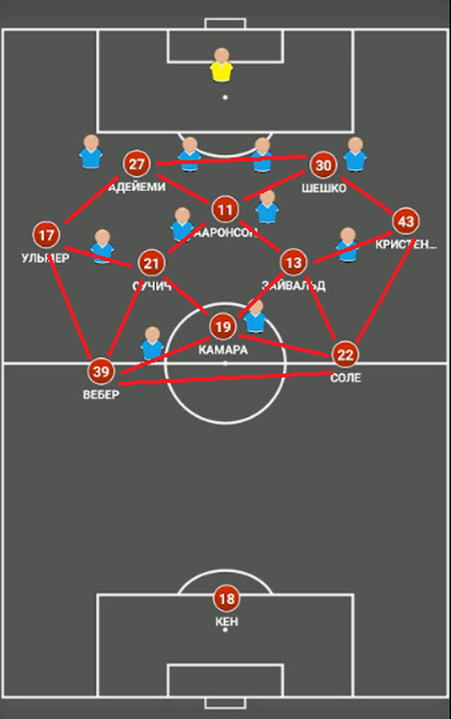 На схеме выше — пример условного колебания этого маятника. Широкие позиции форвардов позволяют одному из них всегда находиться в зоне взаимодействий. Пространство межу нападающими закрывают "десятка" (Ааронсон) и правая "восьмерка" (Сучич).