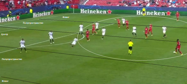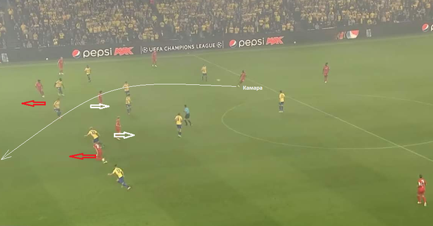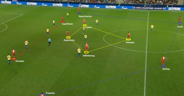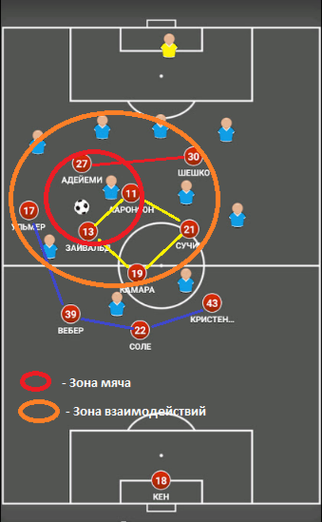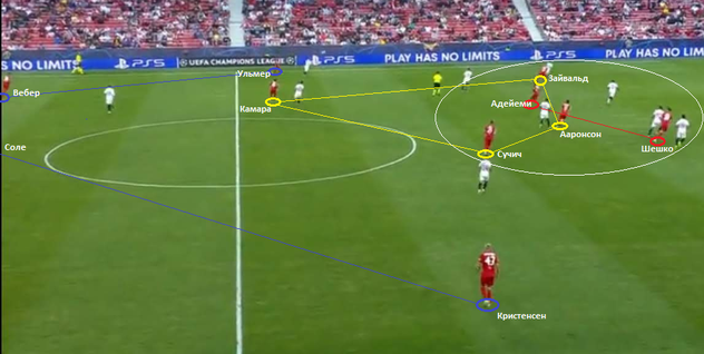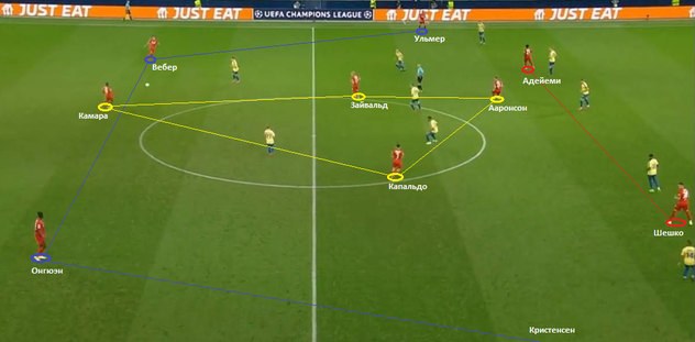 Традиционно, синим цветом у нас отмечена линия обороны, желтым — полузащиты, красным — атаки. В данном случае, пара форвардов, две "восьмерки" и "десятка" стягиваются к левому полуфлангу, куда вот-вот после непродолжительного короткого розыгрыша будет переведен мяч. В таких ситуациях, даже если оборону соперника не удастся прорвать, а контрпрессинг не принесет своих плодов, то Камара и Ульмер смогут притормозить возможный выход Севильи в быструю атаку.