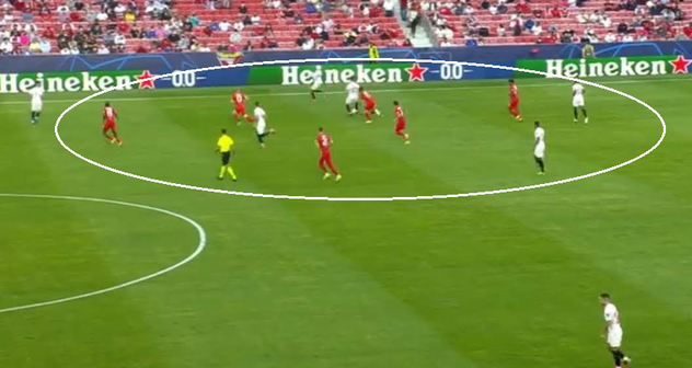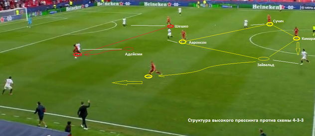Вот похожая структура прессинга из матча с Севильей. Здесь свои особенности. Под каждую схему и под каждого конкретного соперника штаб Яйссле эксклюзивно настраивает свою прессинг-машину.