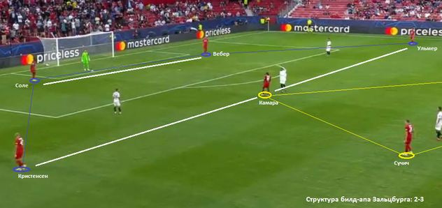 У команды хорошо поставлена позиционная игра в атаке. Мы имеем традиционную для базовой схемы 4-4-2 ромб структуру билд-апа — 2-3, где футболисты располагаются по диагональным векторам относительно друг друга. Если Зальцбургу противостоит соперник с интенсивным высоким прессингом, то к Камара опускается один из инсайдов, в большинстве случаев — Зайвальд.