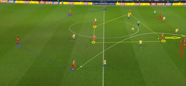В зоне мяча создается треугольник или ромб, а перегруз линии обороны соперника шестью футболистами заставляет оппонентов сжимать структуру, освобождая вертикальные коридоры вне зоны взаимодействий. В подобных ситуациях Зальцбург часто переводит мяч на противоположный фланг.