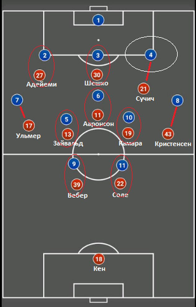 Фактически датчане были поставлены перед фактом — или вынос в поле или игра через левого центрбека. Когда голкипер выбирал второй вариант, Сучич и Кристенсен активировали давление. Остальные игроки чемпионов Дании были разобраны персонально.