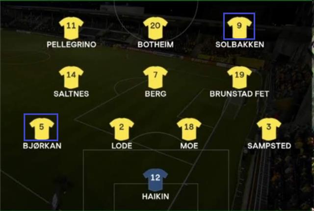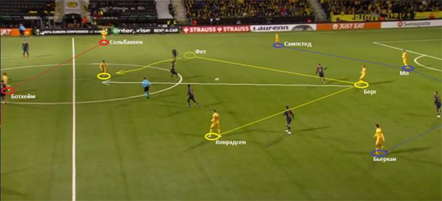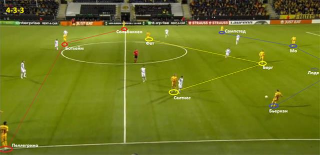 Функции "шестерки" в схеме 4-3-3 выполняет Патрик Берг. Правая "восьмерка" – Сондре Фет, левая – Ульрик Салтнес. В линии атаки на флангах действуют инвертированные вингеры Амаль Пеллегрино и Ола Сольбаккен. Последний настолько хорошо играет левой ногой, что легко выполняет разные по сложности передачи внешней стороной стопы. Если Пеллегрино чаще смещается к центру под правую ногу, то от Сольбаккена можно ждать и рывков к лицевой линии, которые свойственны больше классическим вингерам.