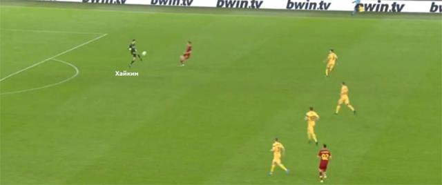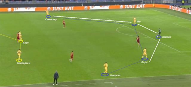 Далее нападающие растягивают линию обороны Ромы, а правый фулбек Сампстед и "восьмерки" разгоняют быстрый выход в атаку. На скриншоте выше – результат банального смещения Фета и точной длинной передачи Хайкина.