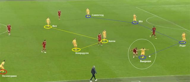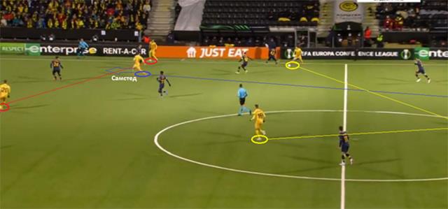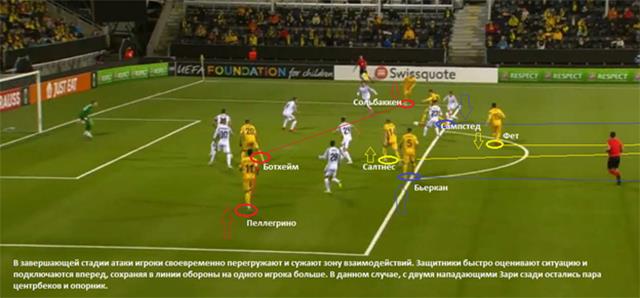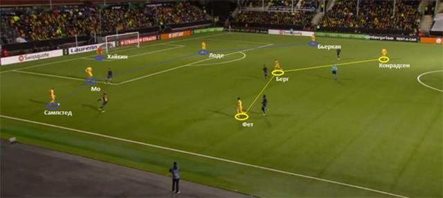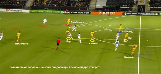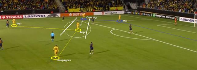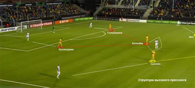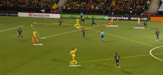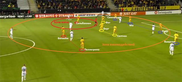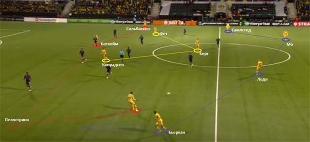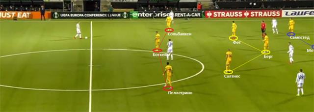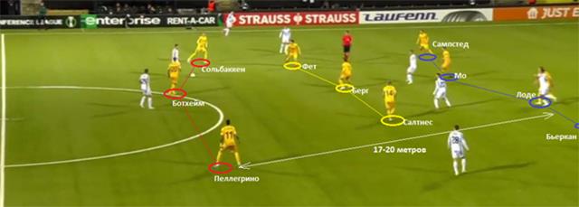 Рассмотрим структуру высокого прессинга. В матче с Зарей норвежцы практиковали персональные ориентировки. Пеллегрино и Сольбаккен отвечали за центрбеков, Ботхейм отходил назад и персонально держал опорника, а Салтнес и Фет держали зону в центре и с зазором контролировали фулбеков.