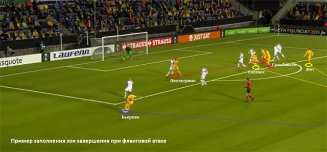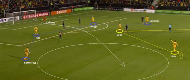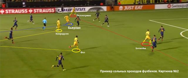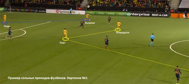 Фулбеки не только развивают атаки сольными подключениями с мячом, Самстед или Бьеркан часто атакуют пространство без мяча. Атака глубины разными игроками позволяют растягивать оборонительный блок по вертикали. Подключения фулбеков способствуют созданию фазового пространства.