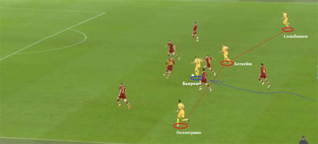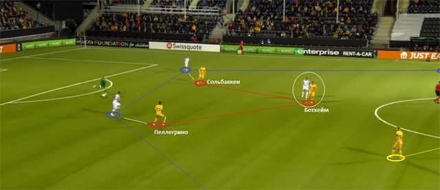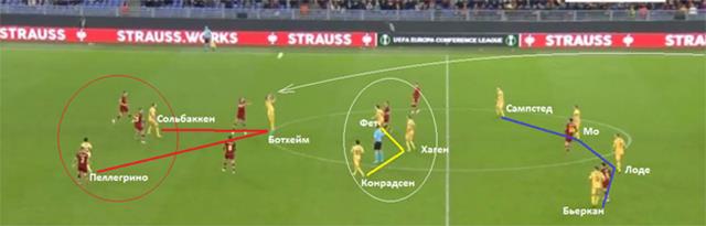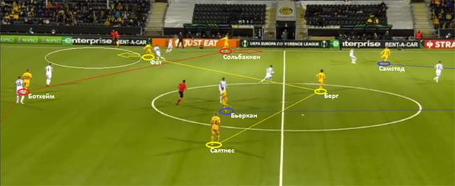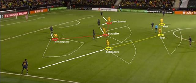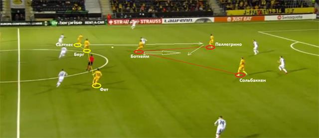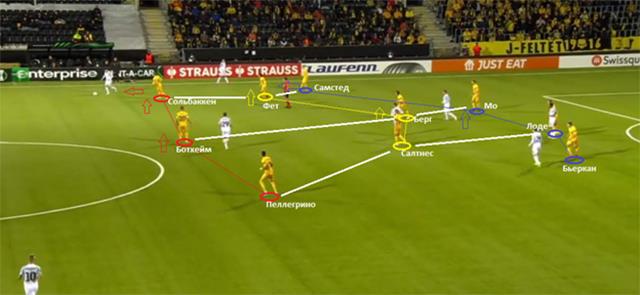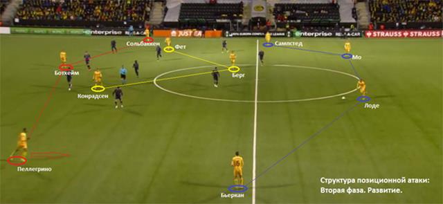 Отдельно остановимся на особенностях структуры команды в конструктивной фазе игры. В фазах построения и развития атаки ее ширину поддерживают инвертированные вингеры Пеллегрино и Сольбаккен. Ботхейм удерживает внимание пары центральных защитников соперника, а "восьмерки" Салтнес и Фет действуют в полупространствах.