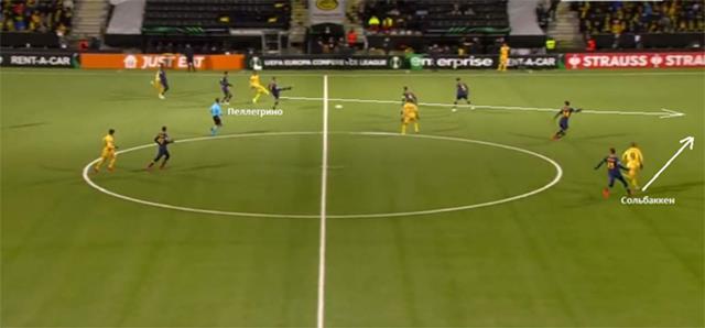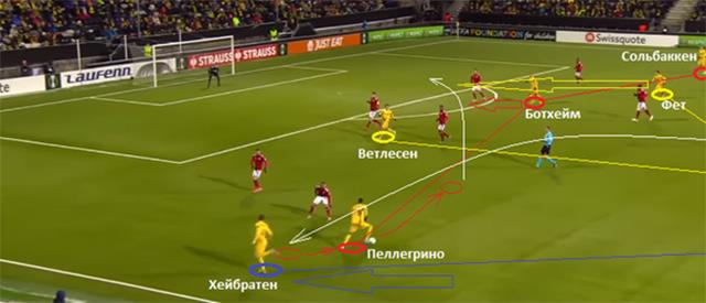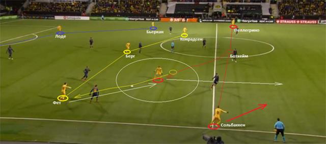 В завершающей стадии атак нужно отметить смещения инвертированных вингеров к центру, под ударную ногу. И Пеллегрино и Сольбаккен обладают хорошим ударом внутренней стороной стопы, а также способны отдать хорошую диагональ за спины защитникам или выдать тонкую проникающую передачу. На скриншоте выше – пример из домашнего матча с софийским ЦСКА. Как только Пеллегрино принялся смещаться с мячом, левый защитник Хейбратен начал забегание по бровке, забирая часть внимания защитников соперника на себя. Левая "восьмерка" Ветлесен уводит за собой центрального защитника. В этот момент в штрафную врывались Ботхейм и Фет. Именно на последнего и прошел заброс Пеллегрино.