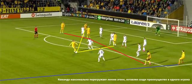 Еще один важный момент. В завершающей стадии атаки игроки своевременно перегружают и сужают зону взаимодействий. Защитники быстро оценивают ситуацию и подключаются вперед, сохраняя в линии обороны на одного игрока больше. В эпизоде из матча с Зарей, который запечатлен на скриншоте выше, можно заметить, что с двумя нападающими команды Скрипника сзади остались пара центрбеков и опорник. Команда не допускает случаев, когда против одного форварда сзади остается 3 защитника, или против двух – 4.