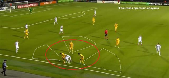 Игроки БГ активировали интенсивное давление, когда мяч оказывался на фланге. Боковая линия – лучшая союзница прессингующих. Бровка значительно ограничивает пространство для выхода из под прессинга.