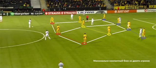 Главная цель высокого блока Буде-Глимт в том, чтобы заставить оппонента отказаться от короткого розыгрыша и спровоцировать его на длинную передачу в борьбу. Нападающие и хавбеки не просто контролировали каждого соперника в отдельности, они старались максимально перекрывать векторы в центральной зоне.