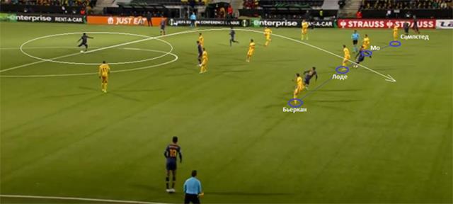 Также, обратите внимание на аномально высокие и узкие позиции фулбеков Бьеркана и Сампстеда. В завершающей стадии атаки команда отказывается от ширины и максимально перегружает центральную зону. В подобных случаях важное значение приобретает контрпрессинг. В этом аспекте команда Кнутсена может дать фору многим, более именитым европейским коллективам.